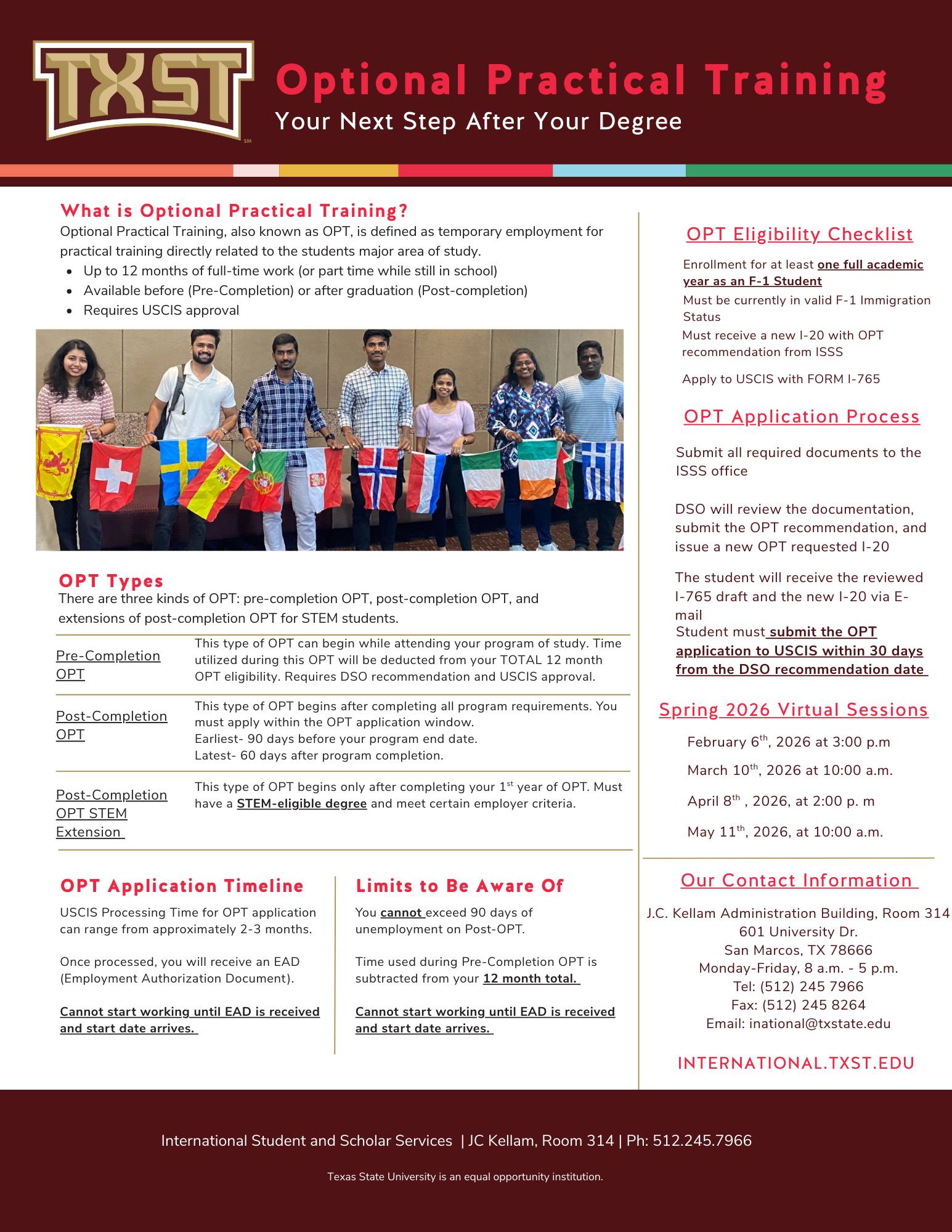 International Student and Scholar Services (ISSS) offers best practices information on Optional Practical Training (OPT) as a courtesy to international students under a Texas State University issued Form I-20. All information provided is not considered legal advice. You may choose to compile and submit your OPT application on your own and inform ISSS accordingly through email.